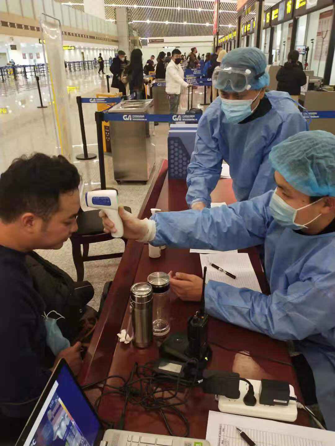 为旅客测量体温。