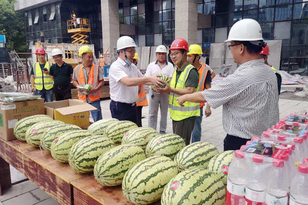 2020年8月11日,受公司党委书记、董事长何志明委托,党委委员、副总经理罗敬军带队前往公司山顶总部基地工程项目现场,为奋战在酷暑下的一线工人们送去防暑降温用品和清凉水果,对他们的辛勤付出表示衷心感谢。同时,要求施工单位合理安排工作时间,做好高温期间劳动保护工作,继续加强工程安全和质量管理,保质保量完成施工任务。